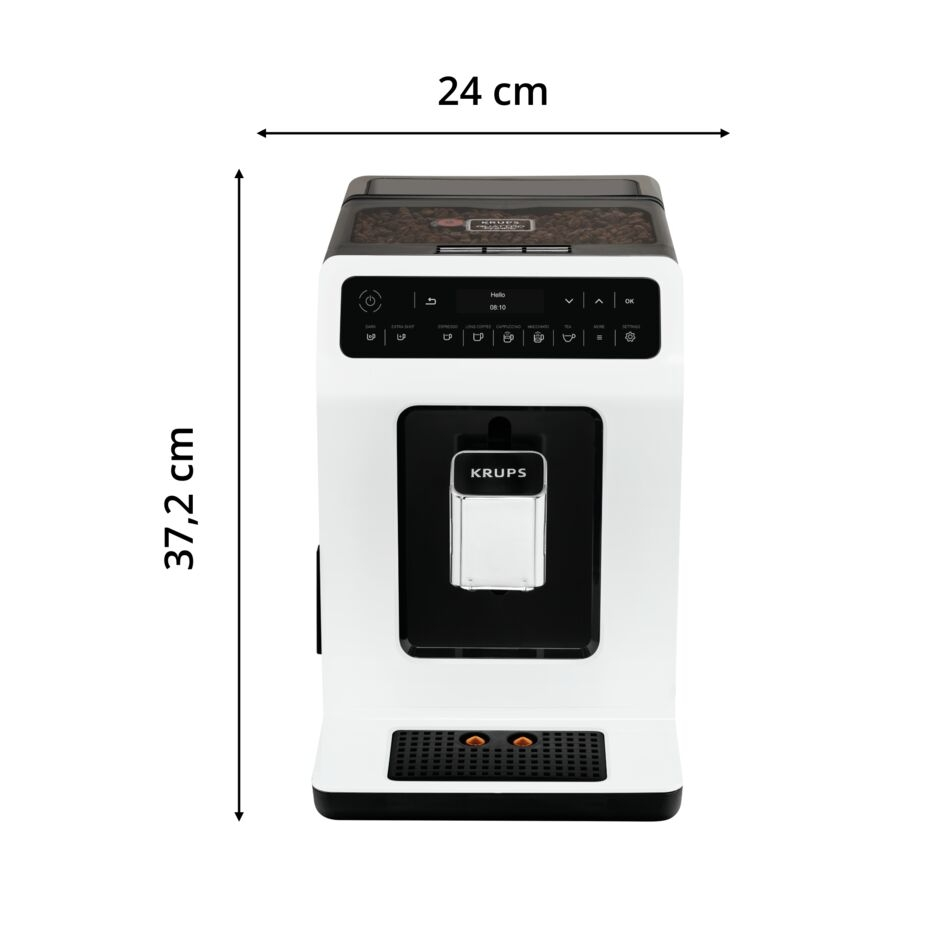 Nova oblika z izredno velikim rezervoarjem za vodo in posodo za kavna zrna, popolne dimenzije in izboljšana ergonomija za maksimalno priročnost.