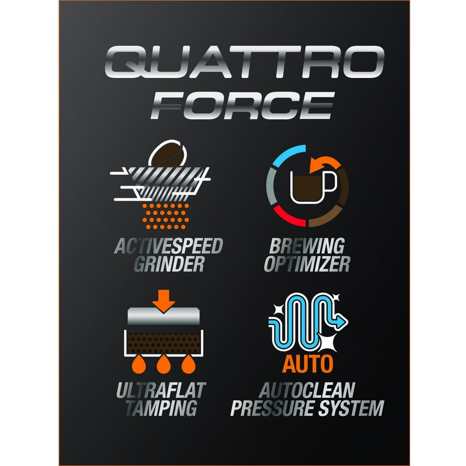 Quattro Force sistem za vsak korak do popolnega espressa, z optimiranim mletjem, potlačenjem, varjenjem in odvajanjem (čiščenjem).