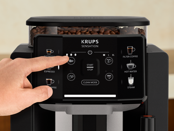 Od popolnega ristretta do tople jutranje filter kave – kavni aparat KRUPS Sensation bo poskrbel za vse. Zahvaljujoč tehnologiji Barista inside, ki optimizira vsak korak procesa priprave, ter priročnim funkcijam, kot so praktičen zaslon na dotik, prilagodljivi recepti in svetlobna opozorila, bo uživanje v popolni aromi kave enostavnejše kot nikoli doslej. Aparat se ponaša z avtomatskim programom za čiščenje.