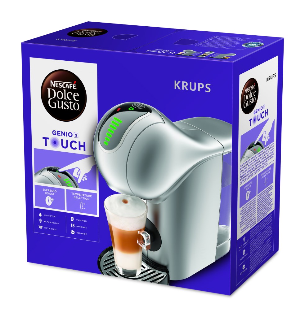 Kompakten Krups® NESCAFÉ® Dolce Gusto® Genio S Touch se ponaša z naprednimi funkcijami, ki jih boste vzljubili – tehnologija Espresso Boost za bolj intenziven in aromatičen espresso, ter nadzor temperature za vrhunsko personalizacijo vseh napitkov. Poleg tega aparat omogoča preprosto obračanje LED obroča, ki omogoča prilagoditev velikosti vašega napitka, od kratkega do XL (300 ml). S svojim visokotlačnim sistemom zagotavlja profesionalno kakovostno kavo z žametno peno. Na voljo je več kot 30 kavnih kreacij.