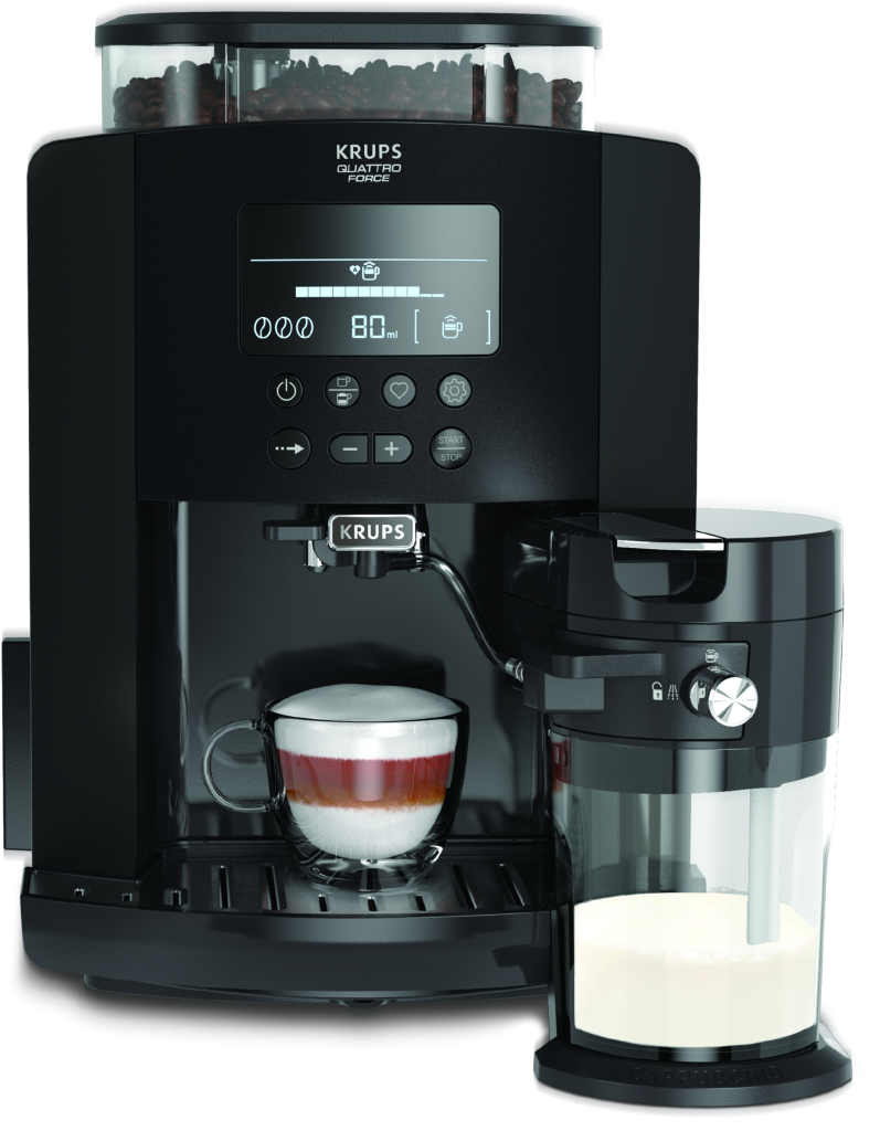 Avtomatski aparat KRUPS Arabica Latte ponuja pripravo okusnega espressa na najlažji način – popolna aroma kave v udobju vašega doma. Zahvaljujoč uporabniškim nastavitvam in zelo velikemu LCD zaslonu, ki nudi enkratno izkušnjo pri pripravi napitka, aparat zagotavlja zmeraj okusen espresso ali božanski cappuccino – z enostavnim pritiskom na tipko. Tri nastavitve za pripravo mleka vam omogočajo, da pripravite kremast napitek po vaši želji, pameten način pa vam omogoča hrambo štirih prilagojenih receptur. Enostavno čiščenje je zagotovljeno zaradi snemljivega rezervoarja za vodo in snemljive posode za mleko, ki je sestavljena iz treh komponent. Sistem KRUPS Quattro Force proizvaja izjemen okus kave, zahvaljujoč posebej oblikovani tehnologiji za optimalno mletje, popoln potisk, pripravo in avtomatsko čiščenje.